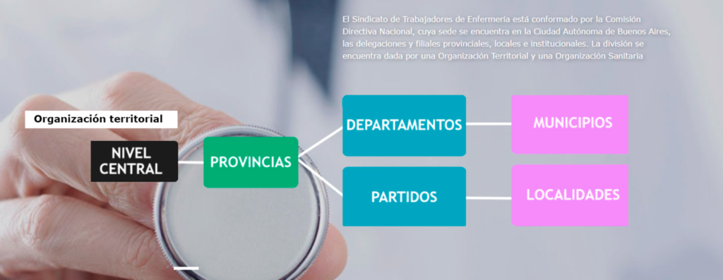 Esta información corresponde a la organización sanitaria dentro del territorio nacional. Los hospitales, clínicasy sanatorios públicos y privados cuentan con presencia de enfermeros y enfermeras del Sindicato de Trabajadores de Enfermería. De la misma manera, los enfermeros nucleados en el SITRE pueden desempeñarse en Unidades de Pronta Atención o en CAPS.